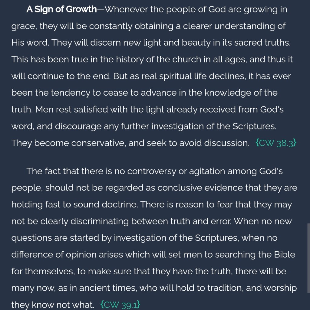 Present Truth has been applied before to adopt NEW principles or stances, but, to at least those who I’ve asked, there doesn’t appear to be an instance where we actually changed our interpretation on anything. (if you are reading this and know of an example of this, please please please contact me! I would love to understand the how/why/what of whatever it is. I have no problem admitting I’m wrong)