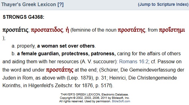In Romans 16:1-2 Paul gives high praise to Phoebe for her helpful nature. What’s interesting is the word used for “helper” here. It’s not used anywhere else. In the Greek, the word is “prostátis.” I’m going to post some screenshots of the translation tools I used for this word.