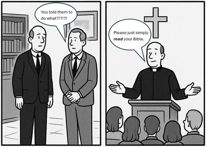 I cracked a smile at one point, realizing that when the church says to “study your Bible,” is that really what they want?